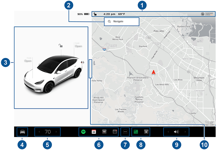 - Status bar: Find car controls and status in the top bar (see Top Status Bar Icons).
