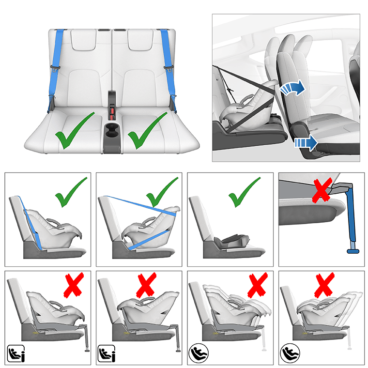 I Model Y kan du montera bältesbaserade stolar på valfritt passagerarsäte, medan ISOFIX/i-Size-system kan monteras på något av de yttre sätena i andra raden. Här nedan kan du läsa detaljerad information om vilka bilbarnstolar som kan användas på respektive säte.