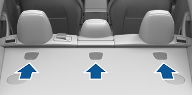 Nedre LATCH-fästen finns i andra radens yttre säten. Fästena sitter mellan sätenas ryggstöd och den bakre dynan. Den exakta placeringen för varje fäste anges av en identifieringsknapp för bilbarnstol, vilket illustreras nedan. Denna knapp är placerad på ryggstödet direkt ovanför dess associerade fäste.