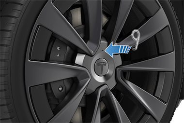 - 将轮毂螺母罩工具(如果配备)(在某些车辆中位于手套箱内,或者您也可以使用小号内六角扳手)的弯曲部插入 Tesla“T”徽标底部处的孔内。注也可以通过汽车零件商店或在线零售店购买轮毂螺母罩工具。