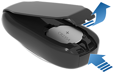 - 将遥控钥匙放在柔软表面上(按钮的一面朝下),用小号扁刃工具撬开底盖。注如果钥匙系有挂绳,则可以用拇指抵住底盖上的“X”,然后将挂绳用力朝自己拉(从而将钥匙从其盖子推离)以松开底盖。您还可以用小扁刃工具、指甲或 Tesla 提供的工具抵住挂绳,撬开底盖。