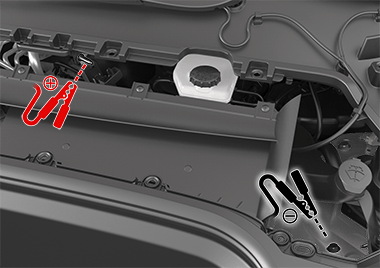 拉回黑色密封件,露出正极跨接接线柱。拆下红色盖子,将外部低压电源的红色正极 (+) 电缆连接到红色正极 (+) 跨接接线柱。警告为避免损坏车辆,请勿让正极电缆接触其他金属组件。