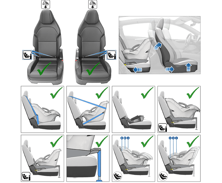 - 使用适合 Model Y 中特定座位的儿童约束系统。每个乘客座椅都支持多种选择。如需详细了解各乘客座椅适用的儿童约束系统类型,请参阅副驾位座椅和第二排座椅。