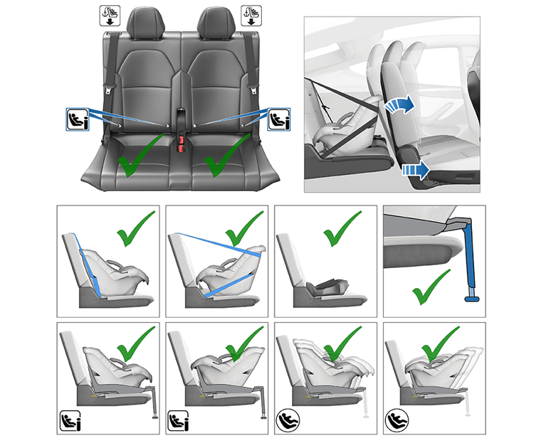 婴儿和儿童可以借助安全带固定式儿童约束系统或 ISOFIX (IU)/i-Size (i-U) 儿童约束系统乘坐第二排外侧座椅。